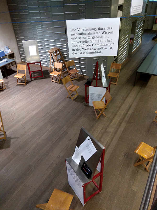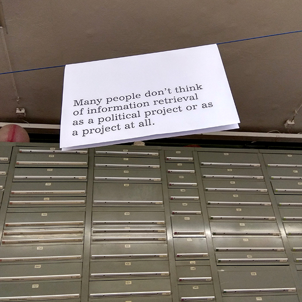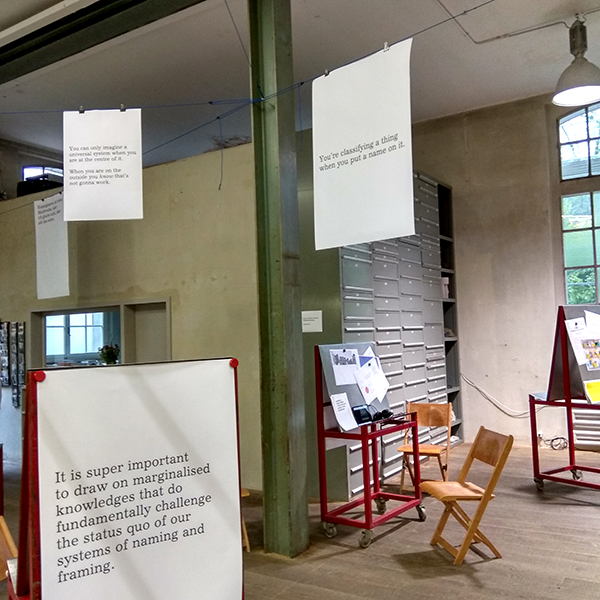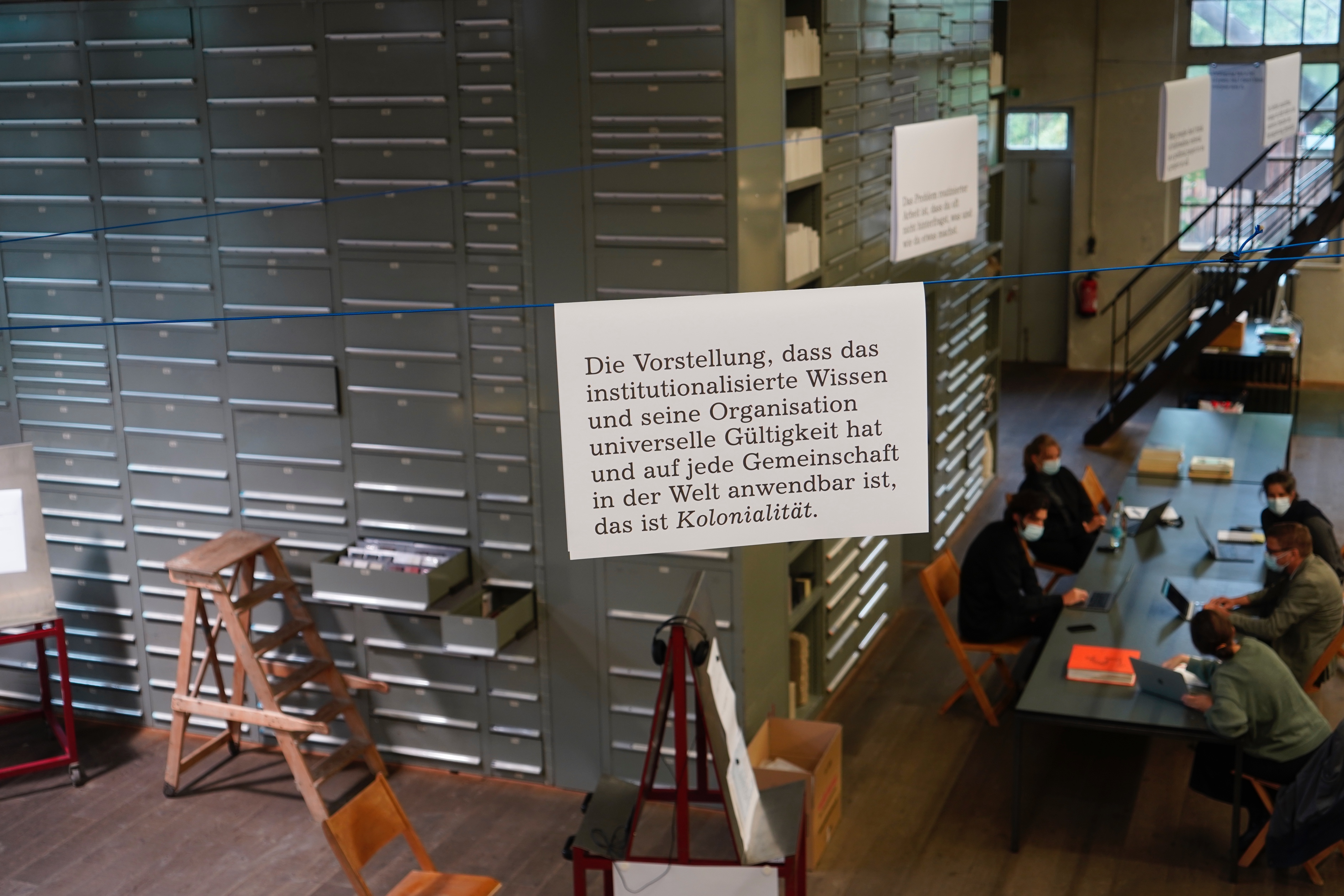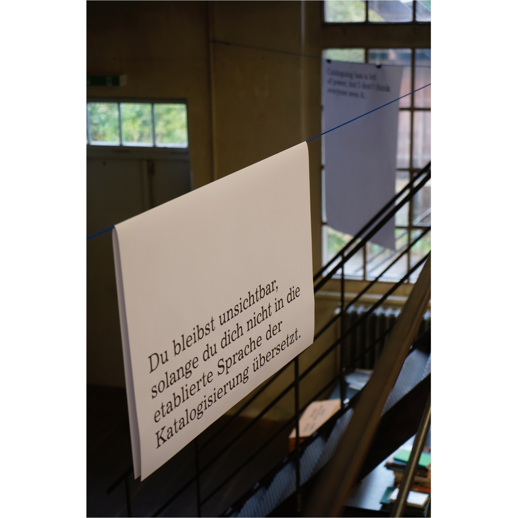 Libraries are vital sites for access, activation and dissemination of knowledge. They are places of strict organisation, standardisation and discipline. Knowledge is here highly formalised and ordered into categories, thematically as well as spatially. The exhibition asks about the methods and practices of describing, naming and classifying, focusing on the library catalogue. Based on the text “Teaching the Radical Catalog” by librarian Emily Drabinski (2008), the exhibition proposes addressing the difficulties and structural inadequacies of classification and making them transparent for those using the library. As a central element, a syllabus is developed that illuminates the socially and historically produced orders and hierarchies underlying the library catalogue. Designed as a process, the exhibition and syllabus will be in conversation with practitioners, collectives and projects working on alternative models which propose decolonial and feminist methodologies for reforming normative concepts of validating, preserving and making available. The exhibition is embedded in a three-year project of the Sitterwerk Foundation to further develop the Dynamic Order System, which explores the possibilities of knowledge practices in libraries and archives.